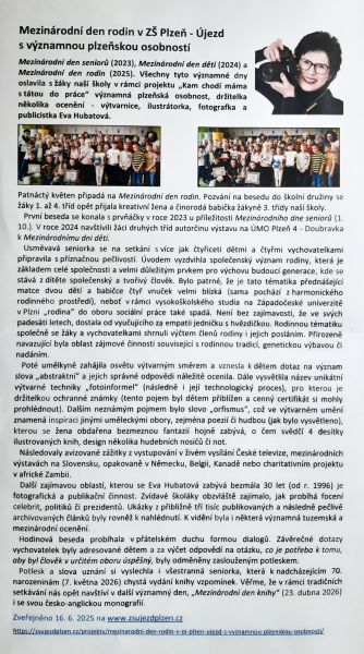 Držitelka Evropské ceny Zlatá Europea, fotografka, publicistka, ilustrátorka a výtvarnice Eva Hubatová se aktivně a dlouhodobě zapojuje do významných společenských a kulturních aktivit nejen v Plzni a ČR. Prezentovala své originální výtvarné techniky "fotoinformenl" a "orfismus" také v Německu, na Slovensku, v Belgii, Kanadě i v africké Zambii. Při pravidelném setkávání s dětmi Základní školy Plzeň-Újezd si letos paní Eva připomněla Mezinárodní den rodin velmi poutavou besedou. V následujícím roce se děti mohou těšit na setkání a povídání k příležitosti Mezinárodního dne knihy (23. dubna 2026).